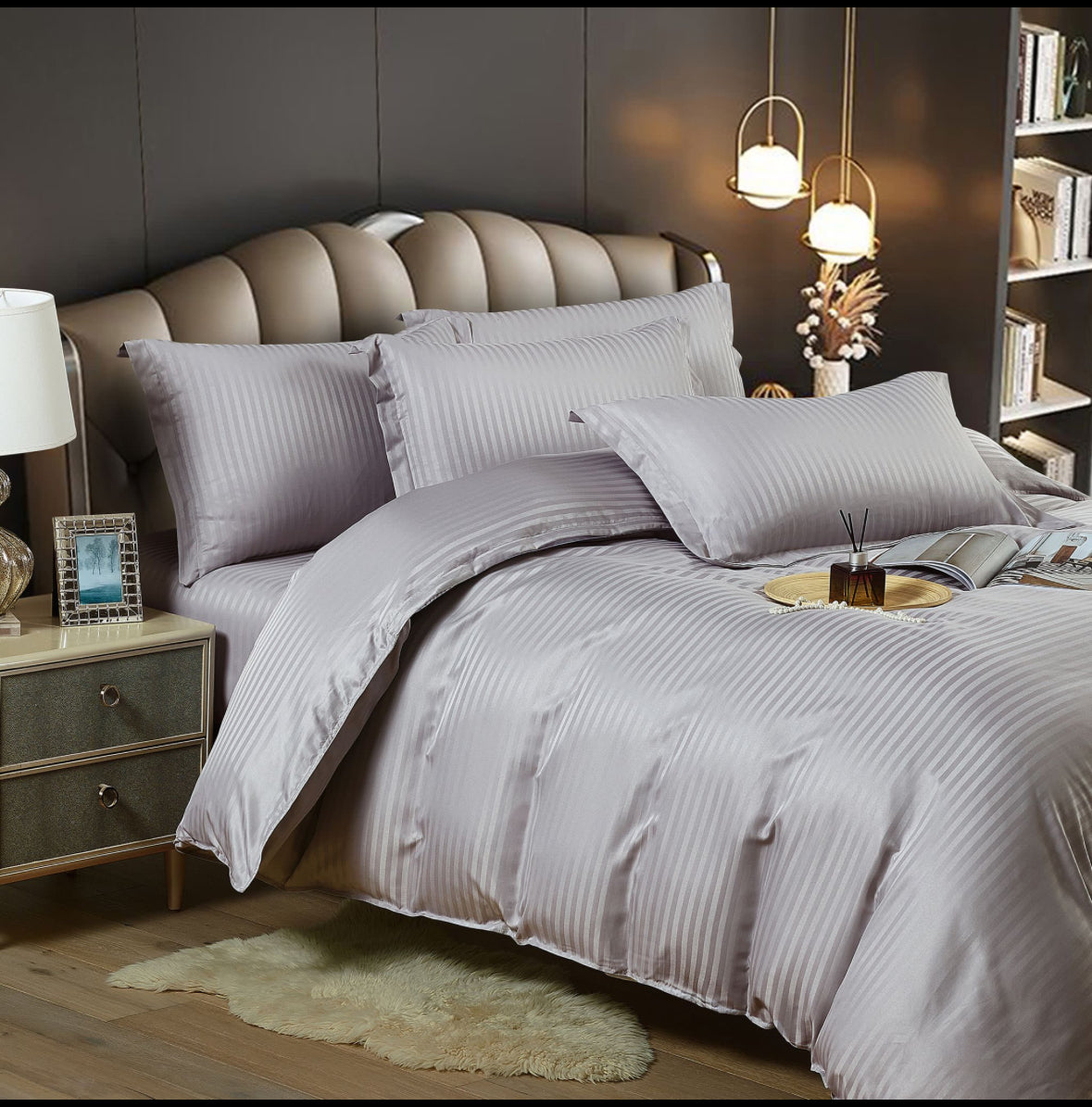 • Material: 100% bumbac Damasc – țesătură de lux, rezistentă și elegantă, cu dungi fine satinate